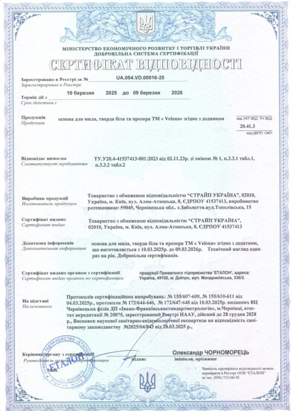 Сертифікат підтверджує, що наша основа для мила виготовляється згідно з чинними технічними умовами (ТУ) та відповідає вимогам якості й безпеки.