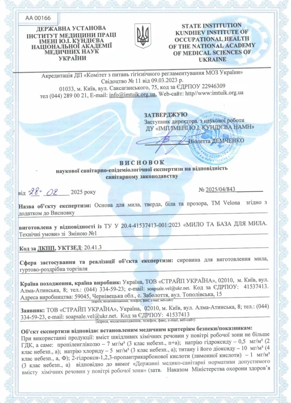 Основа для мила TM Velona (біла та прозора) пройшла наукову санітарно-гігієнічну експертизу в Інституті медицини праці ім. Ю. І. Кундієва НАМН України та визнана такою, що відповідає санітарному законодавству.